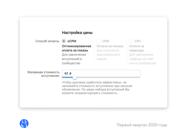 стала доступна для цели «Вступления в сообщество». Модель работает с форматом «Запись с кнопкой» и кнопками «Вступить», «Подписаться» и «Я пойду».