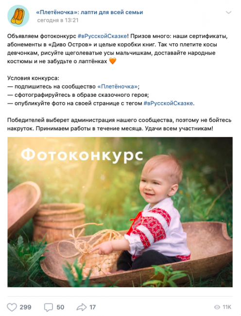 Пускай трогательная истории Марии Ивановны, которая сплела уже 2500 пар лаптев покорит клиентов. Без шуток, людям интересно читать о людях. Нужно придумать вопросы, поболтать с сотрудником за чашкой чая и опубликовать в сообществе текст от первого лица с привлекательной фотографией.