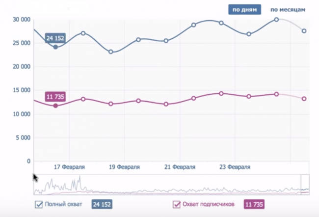 - Охват аудитории. Проанализируйте статистику сообществ из списка доступных. Охват подписчиков помогает понять, сколько пользователей, состоящих в сообществе, просматривают публикации. Полный охват отражает всех читателей за период и показывает, сколько просмотров вы можете получить.Также вы можете перейти в сообщество и посчитать среднее количество просмотров записей на стене за анализируемый период вручную.