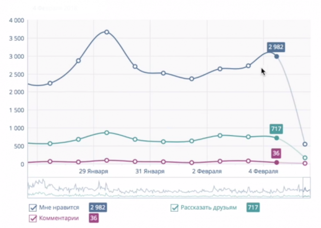 - Обратная связь. Показывает вовлеченность пользователей в материалы, публикуемые группой. Эта метрика помогает понять, насколько «живое» сообщество. Если на графике «Охват аудитории» вы увидели хорошую динамику, а показатели обратной связи невысоки, скорее всего, сообщество потихоньку вымирает, и размещать рекламу в нем не имеет смысла. Чем больше отметок «Мне нравится», комментариев и репостов, тем более активно аудитория вчитывается в публикуемые материалы и с большей вероятностью отреагирует на вашу запись.