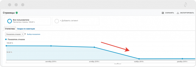 На примере видно, что на протяжении длительного периода количество просмотров практически не менялось, но в определенный момент просмотры выросли, а число отказов снизилось.