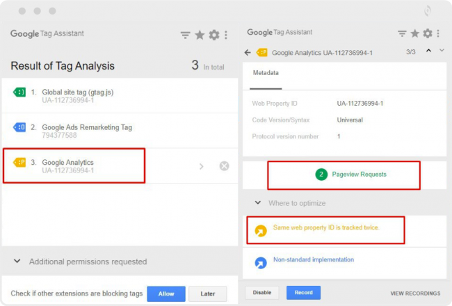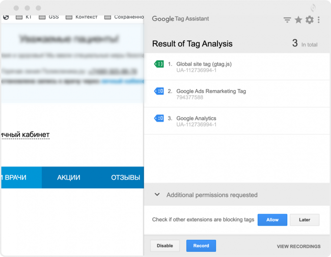 Первое, что нужно проверить в такой ситуации — корректность установки кода счетчика на сайте или интеграцию через Google Tag Manager. Сделать это можно с помощью расширения браузера Google Chrome Tag Assistant. Если ярлык счетчика отображается не зеленым улыбающимся смайликом, то система установлена некорректно.