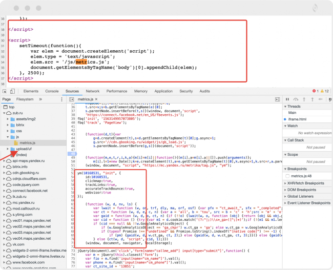 В нашем случае мы нашли папку metrics.js, в которой хранится код нашего счетчика.