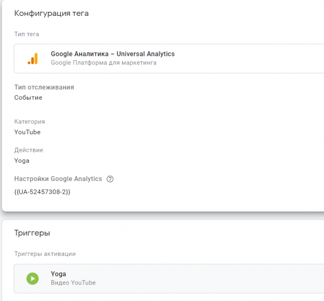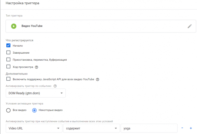 Затем необходимо настроить триггер. Идем в раздел «Триггеры», нажимаем «Создать — Видео YouTube». Для примера настроим триггер на просмотр видео о йоге. В этом случае URL видео содержит слово yoga: