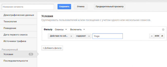 После этого создаем в Google Analytics сегмент пользователей, которые просматривали видео про йогу. Для этого нажимаем на «Добавить сегмент — Новый сегмент — Условия» и в открывшемся фильтре выбираем условие «Действие по событию» содержит Yoga (то, как вы прописываете действие должно четко соответствовать тому, как вы задали его ранее в GTM).