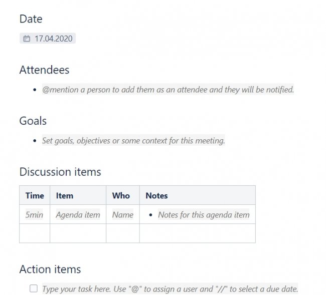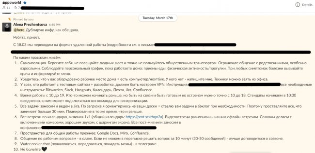 Последние 1,5 месяца для многих компаний выдались сложными: пандемия и экономический кризис — реальность, в который нам предстоит сегодня жить и работать, не теряя при этом — а лучше повышая — свою эффективность. Первое, что мы сделали в ppc.world, когда стали понятны риски и масштабы проблемы, — перешли на удаленный формат работы и отстроили процессы. В нашей команде есть отдел разработки, редакция, маркетинг и образовательное направление — всего 11 человек. Редакция работает из других городов уже давно, поэтому небольшой опыт в удаленке у нас был, но вся команда перешла на новый формат впервые. Спустя время стало понятно, что эти процессы хорошо работают и приводят к результатам. Делюсь нашим опытом и полезными инструментами, с которыми мы работаем ежедневно. С чего начали Здесь для нас было несколько важных этапов: обеспечить условия для работы, договориться о правилах взаимодействия в удаленном формате и запланировать проекты на ближайшее время. Подготовиться технически Руководителям надо убедиться в том, что команда полностью готова к переходу на удаленку: У сотрудников есть ноутбук и другая рабочая техника: монитор, принтер, телефония и т. п. У всех настроен VPN и есть доступ к нужным рабочим ресурсам и пространствам. Сотрудники подтвердили, что могут оборудовать дома комфортное рабочее место. Если с этим есть сложности — посодействуйте, например привезите технику или мебель из офиса. Все, кто работает с документами, понимают, как на удаленке осуществляется документооборот. Для этого должны быть четкие инструкции. Есть регламенты по кадровым процессам: сотрудники должны понимать, как при необходимости оформить отпуск, отгул, больничный и т. п. Договорились о правилах работы внутри команды Самое важное из организации наших процессов: Определили обязательное время присутствия онлайн с 10:00 до 18:00. Начало рабочего дня у нас гибкое, каждый сотрудник может подстроить график под себя. Каждый день утром проводим встречи Daily Stand-up для синхронизации. На таких 20-минутных встречах каждый участник команды рассказывает про результаты прошлого дня и о планах на предстоящий. Это помогает всем оставаться в контексте и не упустить важное. Все командные встречи ставим в общий публичный календарь. Таких встреч у нас несколько: Stand-up, PBR, общие планерки, ретроспектива по итогам крупных проектов, планирование. Отдельно у сотрудников есть 1?1 встречи с руководителем и встречи по проектам. По итогам встреч обязательно пишем постмитинги и храним их в общем пространстве команды — в Confluence. Шаблон постмитинга Все задачи ведем в таск-менеджере Jira. Планирование по спринтам происходит каждые две недели, у некоторых отделов свой формат. Для коммуникации есть несколько каналов. Электронная почта — для долгосрочных переписок, обсуждений крупных проектов, общения с партнерами или контрагентами. Мессенджер Slack — для оперативного обсуждения любых вопросов с командой и коллегами. Видеосвязь через Hangouts — альтернатива всех офлайн-встреч, для большей причастности и укрепления общения подключаемся с включенной камерой и хорошим звуком. Для неформального общения в формате «пожаловаться, порадоваться, покидать мемы» — создали water cooler chat в Телеграме. Такие чаты еще больше объединяют удаленных сотрудников, повышают вовлеченность и часто именно там люди делятся 