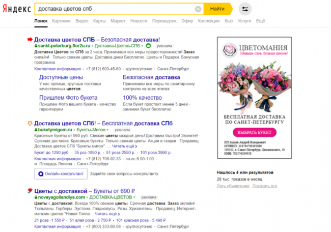 Следующее, что нужно сделать, — ввести запрос, связанный с вашим продуктом, в поисковую строку Яндекса, и посмотреть, какие объявления показываются по этому запросу.