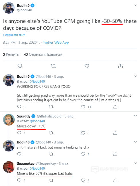 И это не единственный случай. Например, у еще одного зарубежного блогера (2 миллиона подписчиков на Ютубе), CPM просел на 30-50% (впрочем, как и у других опрошенных):
