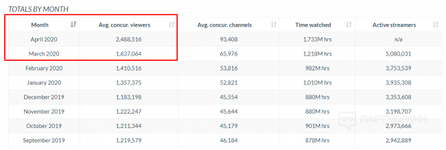 В целом, если посмотреть на статистику стриминговой платформы Twitch, то мы видим огромный прирост в зрителях, с 1 637 064 в марте до 2 488 516 в апреле: