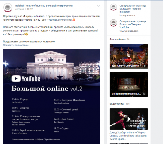 Музеи, театры и филармонии приглашают зрителей на онлайн-трансляции спектаклей. Например, Большой театр запустил проект «Большой online», чтобы зрители могли смотреть любимые спектакли и балет на канале театра в YouTube.