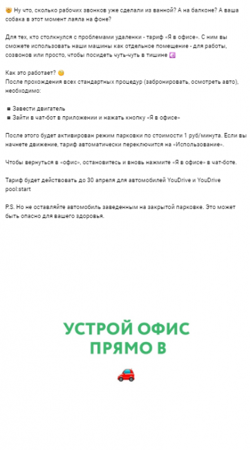 А сервис каршеринга YouDrive разработал тариф «Я в офисе». Если у вас дома шумно, и вы не можете сконцентрироваться на работе, забронируйте машину, возьмите с собой ноутбук и поработайте в тишине.