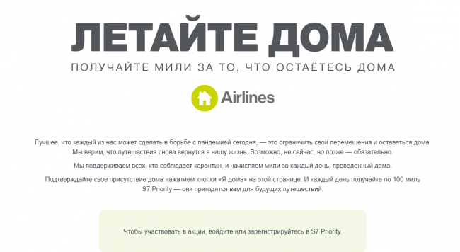 Авиакомпания S7 начисляет 100 миль за каждый день, проведенный дома. В дальнейшем вы сможете потратить эти мили, когда границы откроются и снова будет можно путешествовать