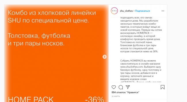 Даже во время самоизоляции хочется выглядеть хорошо. Петербургский бренд одежды SHU clothes подготовил уютную хлопковую линейку для дома. На нее можно получить скидку, введя кодовое слово и собрав все элементы набора: футболку, толстовку и три пары носков.