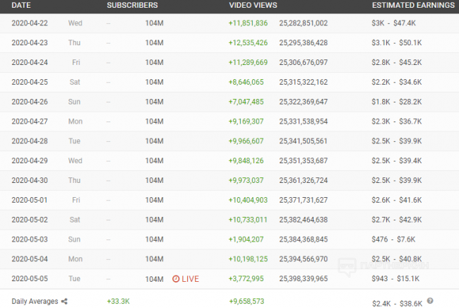 Сервис SocialBlade, основываясь на общеизвестных цифрах, таких как просмотры видео, выдает широкий разброс возможного заработка блогера — от $72 тысяч до $1,2 миллиона в месяц.