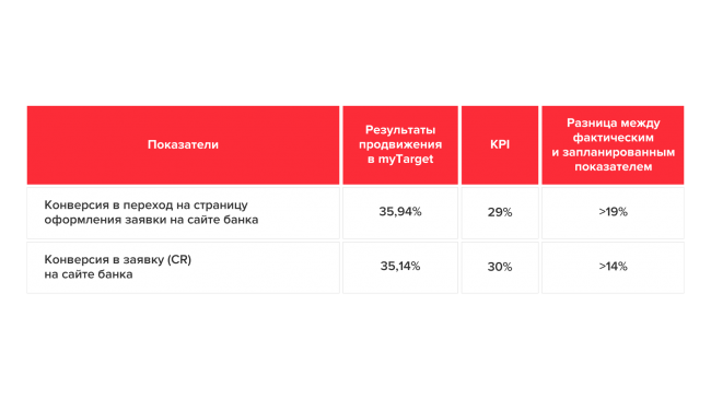 Чуть больше чем за две недели кампания в myTarget перевыполнила основные KPI и показала высокие результаты по сравнению со средними показателями по рекламным каналам, которые использует сервис: конверсия в переход на страницу оформления заявки на сайте банка была на 19% выше KPI, а конверсия в сами заявки — на 14%.