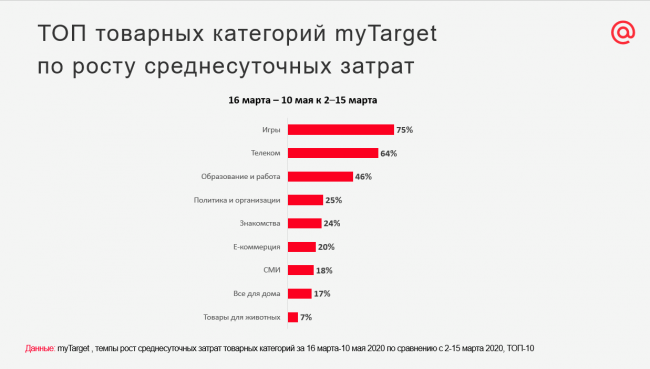 В частности, интернет-магазины, сервисы доставки (еда, рестораны и т. д.), образовательные и развлекательные сервисы, банковские дистанционные услуги и страхование находятся сейчас на подъеме. «Люди понимают, что карантин продлится долго, и хотят обеспечить себе комфортную работу и интересное времяпрепровождение дома, — комментирует директор отдела таргетированной рекламы iConText Group Александр Крупин. — Для брендов это шанс сделать онлайн-потребление более обыденным, привлечь новую аудиторию и напомнить старой, более лояльной аудитории, что бренд заботится о них».