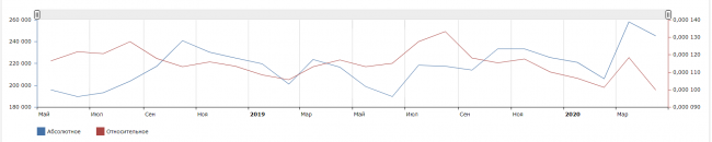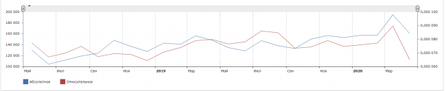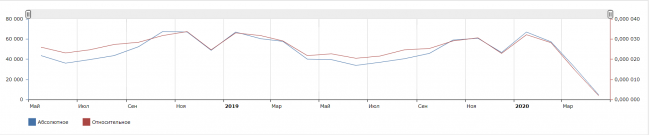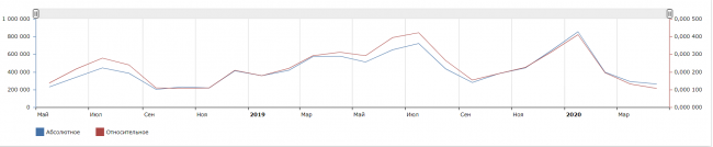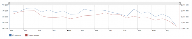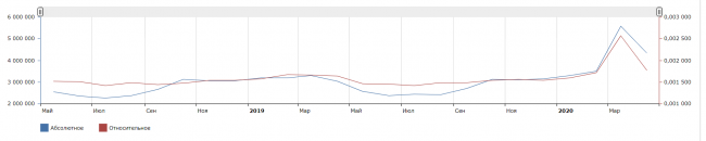 Далее число запросов постепенно снижается от недели к неделе, но остается значительно выше предыдущих периодов. В целом рост в апреле 2020 относительного аналогичного месяца прошлого года более 40%.