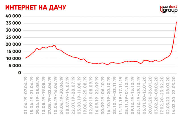 Дачный сезон начался раньше, из-за карантина многие стараются покинуть крупные города. Количество запросов по ключевому слову «интернет на дачу» в марте 2020 года в Москве увеличилось в 2,3 раза относительно марта 2019 года.