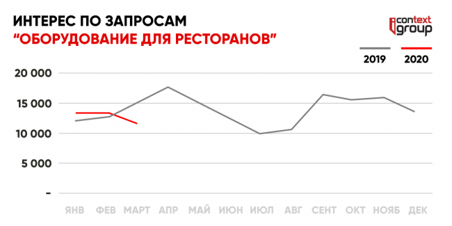 Объем интереса к категории оборудования для ресторанов нарастал в январе — феврале, ожидалось оживленное начало весенне-летнего сезона. Но в связи с закрытием мест массового посещения в марте и апреле интерес к этой категории сократился. В этой ситуации компаниям, ориентированным на обеспечение предприятий питания, стоит обратить внимание на b2c-сегмент. Здесь идет скачкообразный рост спроса на доставку товаров для дома. В эту категорию может входить посуда, столовые приборы и техника для кухни.