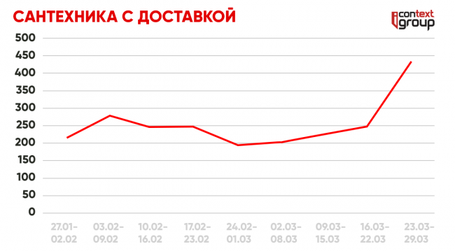 Один из успешных кейсов клиента iConText Group, подтверждающий, что смена стратегии может дать отличный результат. После введения режима самоизоляции посещаемость гипермаркета сантехники снизилась на 85% (неделя 30.03–05.04 относительно недели 23–29.03). Было принято решение изменить стратегию и сместить приоритет в сторону электронной торговли. За несколько дней были разработаны новые креативы и тексты рекламных объявлений, основное сообщение в коммуникации — «Мы работаем и можем доставить сантехнику домой». Поисковые рекламные кампании были усилены, чтобы максимально охватывать возрастающий спрос на сантехнику с доставкой.