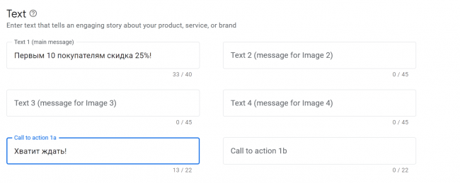 В некоторых шаблонах на изображении можно указать либо текст, либо цену, а также заполнить призывы к действию. Обратите внимание, что для текстовых полей есть лимиты.