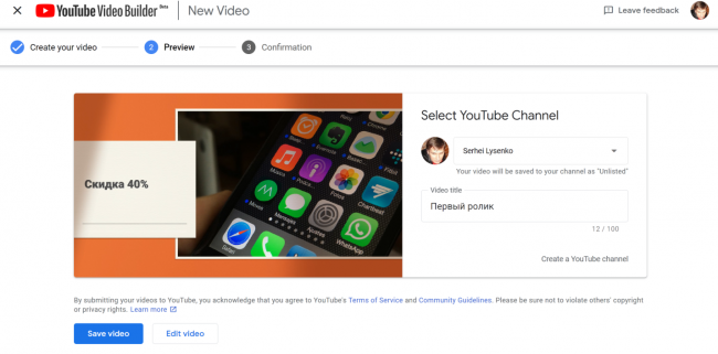 Когда ролик готов, его можно посмотреть и отредактировать. Если все устраивает, то сохраняем, публикуя на своем канале. Если канала на YouTube еще нет, то его можно создать — перейдите по ссылке в правом нижнем углу.