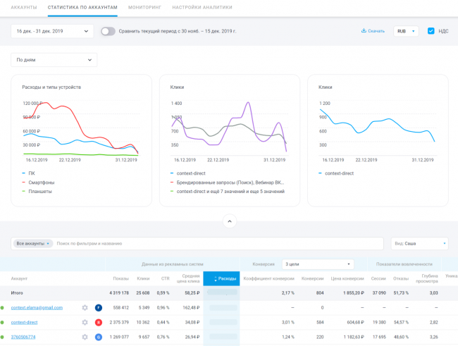 Тут представлены более детализированные данные по основным рекламным системам: Яндекс.Директу, Google Ads, «ВКонтакте», Facebook Ads и другим. С уровня аккаунтов можно перейти к кампаниям, объявлениям и ключевым фразам.