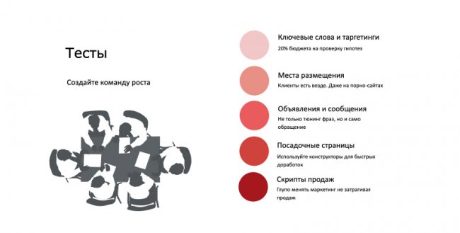 Тестировать нужно все! Каждый элемент маркетинговой стратегии — различные сочетания креативов, каналов, сообщений и посадочных страниц могут дать кратный прирост конверсии. Более того, маркетинг должен, даже обязан влиять на скрипты продаж, ведь от того, каким рекламным сообщением был привлечен клиент, зависит, что ему продавать. Продажи в этом смысле — часть маркетинга.