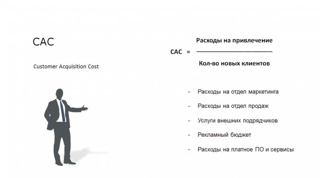 Первый показатель — Customer Acquisition Cost, стоимость привлечения клиента. Казалось бы, его легко определить: переходим в рекламный кабинет, смотрим, сколько денег мы потратили и сколько клиентов получили.