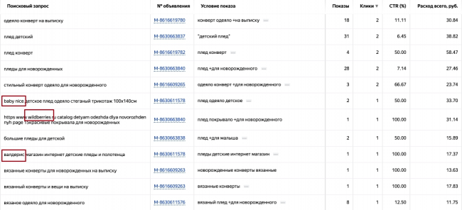 Анализ поисковых запросов и добавление новых минус-слов необходимо делать регулярно, это позволит уменьшить количество нецелевых кликов и сэкономить бюджет. Статистику по поисковым запросам можно посмотреть в интерфейсе.