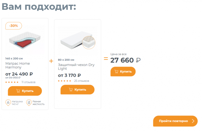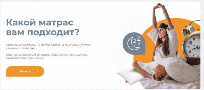 После прохождения квиза пользователь получает рекомендацию подходящего под его запросы матраса.