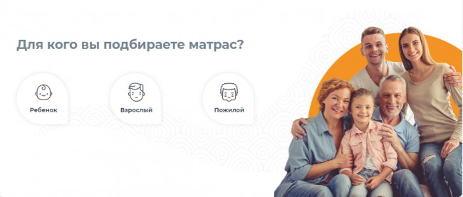 В конце страницы добавили переход на квиз с подбором матраса. Сначала пользователю предлагается выбрать, кто будет спать на кровати: ребенок, взрослый или пожилой человек, один или в паре. Если пара, нужно указать разницу в весе между партнерами. Дальше идет еще несколько вопросов о проблемах, привычках и предпочтениях покупателей.