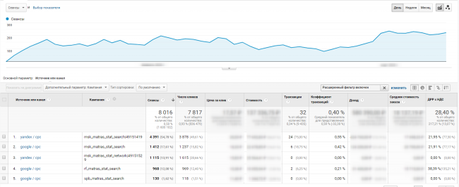 Собрали семантику, сгруппировали запросы, добавили общие тексты с кампаний по матрасам. Изначально выставили ставку в 30 рублей на все ключи (этого хватало для охвата в 80%). Кампании запустили в Яндексе (поиск и РСЯ) и Google только поиск. После запуска кампания оптимизировалась на общей основе. В Яндексе используем ручное управление ставками. В Google сначала все делали также вручную, но цена клика была высоковата, поэтому перевели кампанию на стратегию «Целевой процент полученных показов».