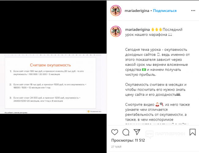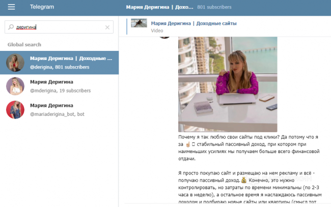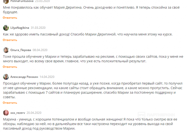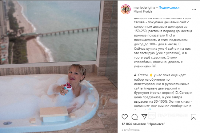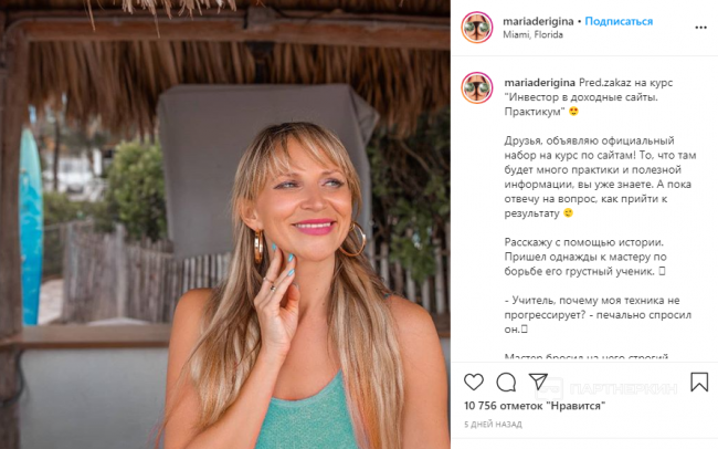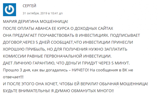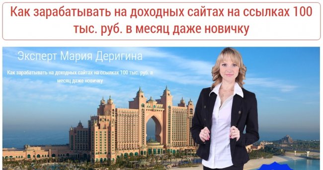 Нет основания не верить, что Деригина зарабатывает $30 000 в месяц — только это деньги не от «доходных сайтов», а скорее от доверчивых пользователей, которые захотели быстро разбогатеть. У вас остались еще сомнения, что именно такая кипучая инфоцыганская деятельность, а не сайты и недвижимость, приносит большую часть доходов для Марии Деригиной?