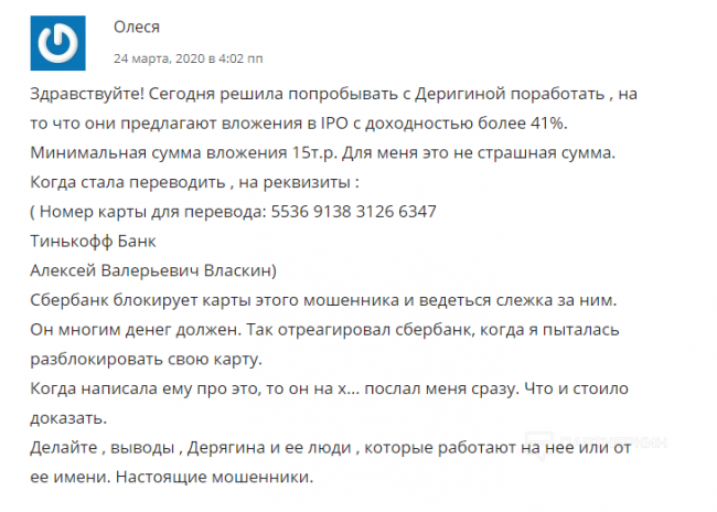 Вот одна из обманутых пишет, что ей предложили IPO с доходностью 41% (Деригина и IPO?!):