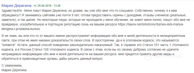 Деригина не любит, когда про нее пишут негативные комментарии. Она не только удаляет их, но и оказывает давление на своих недовольных учеников: