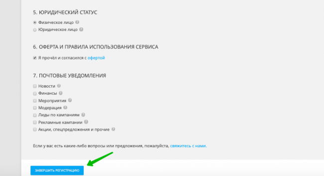 Выбираем язык интерфейса, страну, тип аккаунта (для основных функций будет достаточно аккаунта рекламодателя), юридический статус, принимаем оферту, выбираем уведомления, которые хотим получать на почту.