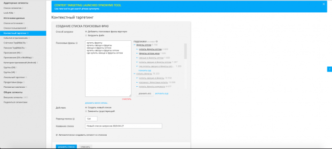 Один из эффективных способов таргетинга — показ рекламы по списку пользователей. Для этого нужно загрузить в систему список с данными пользователей: их ID в соцсетях, список телефонных номеров или почт.