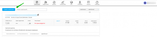 Для создания кампании переходим в раздел «Кампании» и нажимаем кнопку «Создать кампанию».