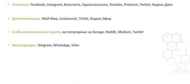 Делим все социальные сети на группы: основные, дополнительные, слабо раскрученные в рунете, но популярные на западе и мессенджеры. Представьте, сколько трафика можно привлечь с помощью только первых двух категорий.