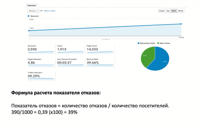 А сейчас поговорим о показателе отказов страницы/сайта. Сразу развеем один из главных мифов. Показатель отказа не имеет ничего общего со временем, проведенным на странице/сайте. Самый простой способ контролировать эту метрику — настроить Google Analytics. Чаще всего высокий показатель отказов свидетельствует о том, что страница не соответствует требованиям пользователей. Но не всегда. Иногда юзеры получают всю нужную информацию на первой странице. В этом случае им нет необходимости листать сайт дальше. Ниже приведена формула расчета показателя отказов.