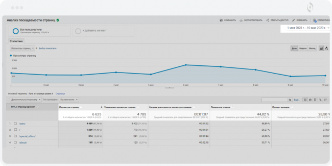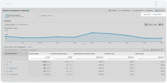 По количеству просмотра страниц показатели отличаются на 0,5% (6655 против 6625). Такое различие может быть обусловлено скоростью загрузки скриптов Google Analytics на сайте. Если рассматривать просмотры отдельно взятых страниц сайта, то отличия будут незначительны.