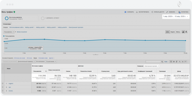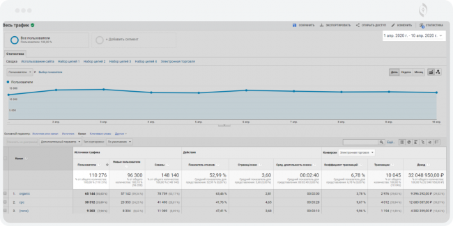 Источники трафика и показатели электронной торговли за 10 календарных дней: с 1 по 10 апреля 2020 года.