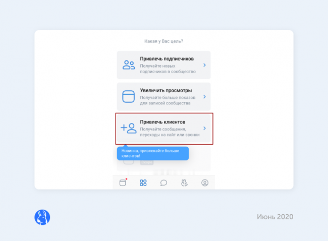 заработала новая цель — «Привлечь клиентов». Специалисту нужно оформить объявление и выбрать призыв: «Написать сообщение сообществу», «Позвонить» или «Перейти на сайт», чтобы у объявления появилась соответствующая кнопка. С этой целью по умолчанию работает стратегия «Максимум переходов за бюджет».