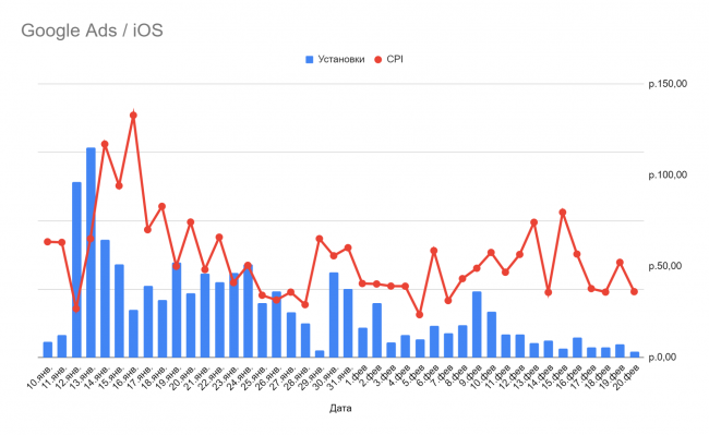 В Google Ads мы получили 60% установок приложения по цене, равной примерно 52 рублям. Из них 68% установок Android приложения и 32% — iOS приложения.