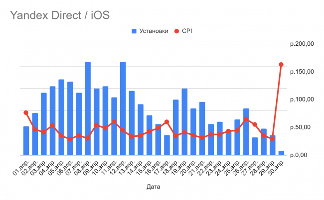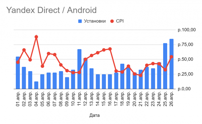 В Яндекс.Директе за месяц работы было всего 4% установок и 111 регистраций на Android, стоимость которых составила 49 рублей и 174 рублей соответственно. В то же время iOS кампании принесли более чем в 1,5 раза больше установок, чем на Android, по цене 43 рублей — что составило 10% от общего объема установок на iOS. Также iOS в этом канале принес два раза больше регистраций по цене 104 рублей за регистрацию.