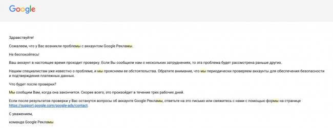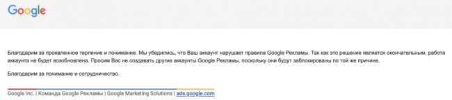 Важно понимать, что блокировка осуществляется без участия человека. Google создал целую систему, которая анализирует множество факторов, она не статична и постоянно адаптируется. Поэтому обойти ее и запустить запрещенную рекламу невозможно. Рано или поздно система вычислит такой аккаунт и заблокирует его. Однако в случае с автоматическими проверками иногда система может заблокировать аккаунт по ошибке.