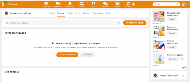 Чтобы добавить в него товары, кликаем на каталог и нажимаем «Разместить товар».