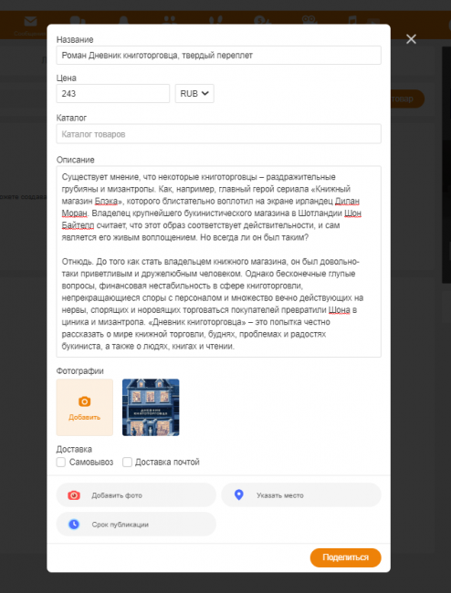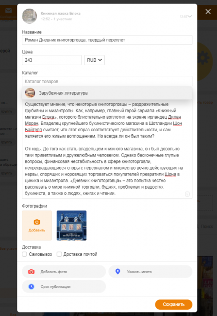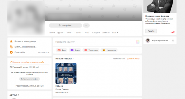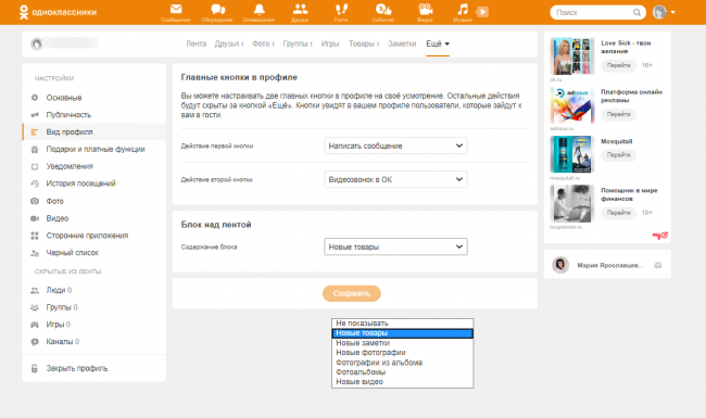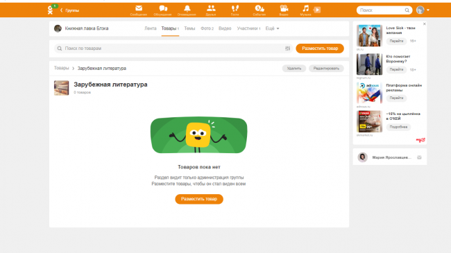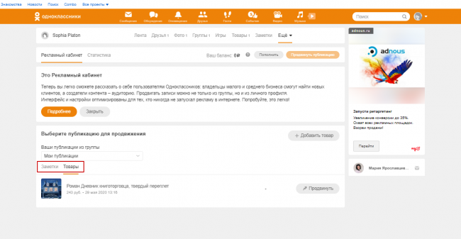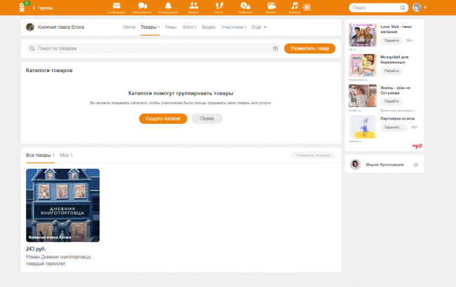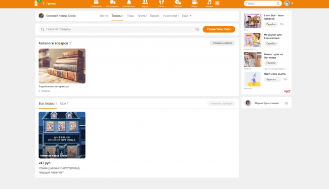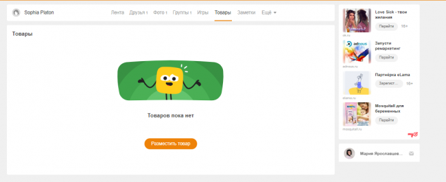 В «Одноклассниках» можно разместить карточки товаров также в личном профиле — это пригодится частным предпринимателям, которые предлагают товары и услуги со своей страницы.