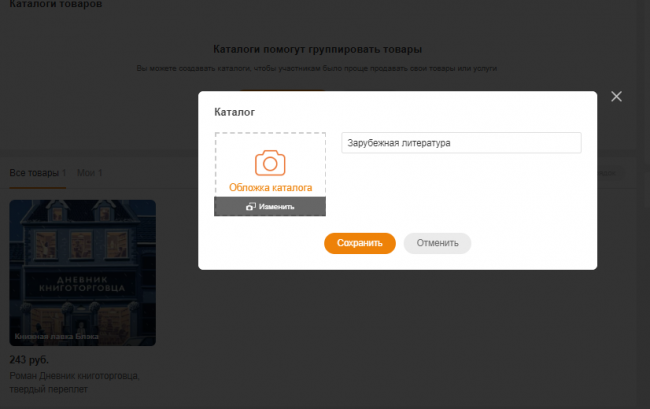 На главной странице группы нажимаем «Создать каталог». Вводим его название (например «Зарубежная литература») и добавляем фотографию для обложки. Сохраняем результат.